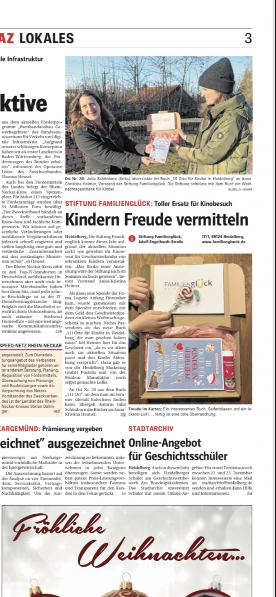 Presse Stiftung Familienglück in der Presse PDFs zum Download 18. Dezember 2020, BAZ: “Kindern Freude vermitteln” 03.April 2020, BAZ: "Wir wollen Glück für alle!" 07. Dezember 2019, BAZ: “Geschenke von Herzen” 10. Dezember 2019, RNZ: “Für gewaltbetroffene Frauen” 29. Juli 2018, BAZ: “Von der Neben- zur Hauptrolle” 05. Dezember 2017, RNZ: “Das sollen alle Kinder lesen” 25./26. November 2017, BAZ: “Weil Familie alles ist” Aktuelles jetzt mithelfen Wir freuen uns über Ihre Nachricht Kontakt